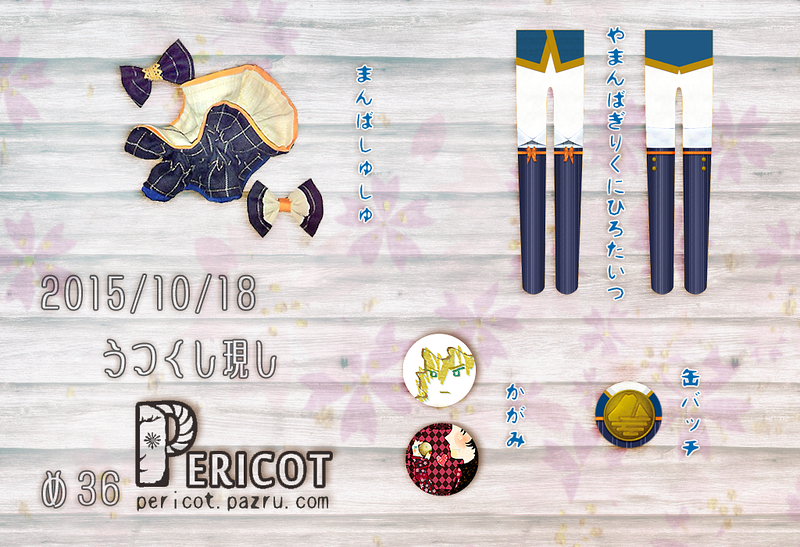 [いべんと]2015/10/18(日) 00:00 うつくし現し/め36 ■ め36 / PERICOT ■ 写しのプリントタイツとか、 写しの鏡とか、 くしゃってるくらいがちょうどいいシュシュなどなど。 お時間ありましたらお立ち寄りくださいませ( 'v')ノ タイツの写真 twitter/_tky_/status/654274063704027136 PR