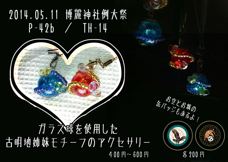 [いべんと]2014/05/11(日) 00:00 博霊神社例大祭/P42b/TH-14 【おしながき】 古明地姉妹モチーフ:1玉ストラップ New!! 古明地姉妹モチーフ:2連玉ストラップ New!! 古明地姉妹モチーフ:1玉指輪 New!! 霊烏路空モチーフ:缶バッチ New!! 火焔猫燐モチーフ:缶バッチ New!! PR